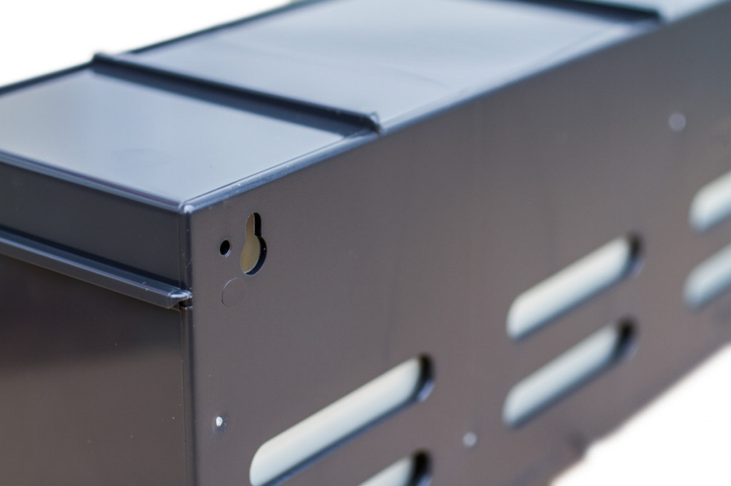 Na zadnej strane sú pripravené otvory na zavesenie na stenu, čo umožňuje jednoduchú inštaláciu aj na závesné systémy. Každá zásuvka má popisovateľný štítok a dá sa kompletne vybrať pre jednoduché čistenie alebo montáž.