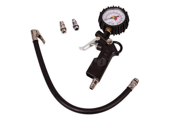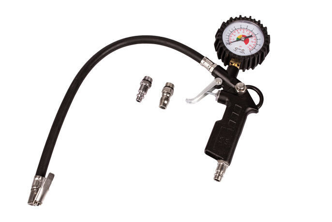 Merač a hustič tlaku v pneumatikách. Rozsah merania 0-12 barov / 0-170 psi. Zástrčky 1/4" pre Európu, USA a Japonsko. Rukoväť s ovládacou páčkou a výpustným tlačidlom.