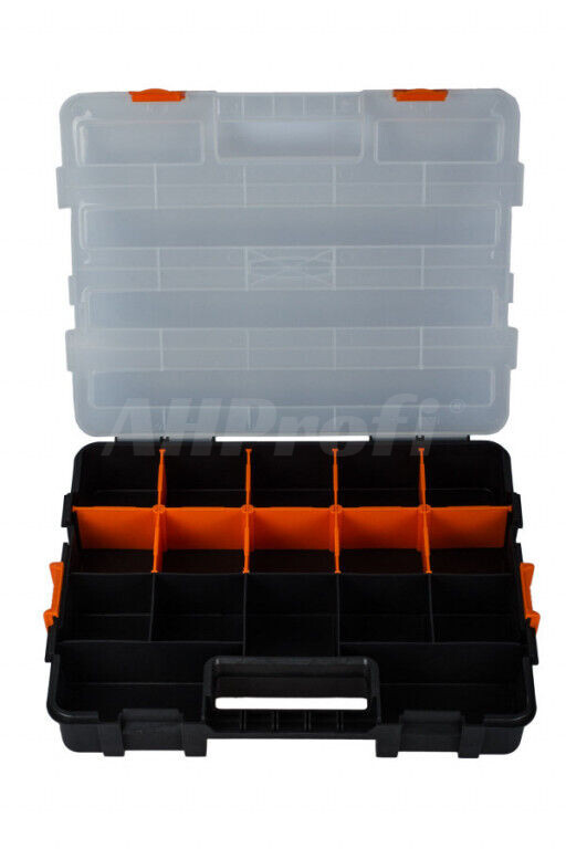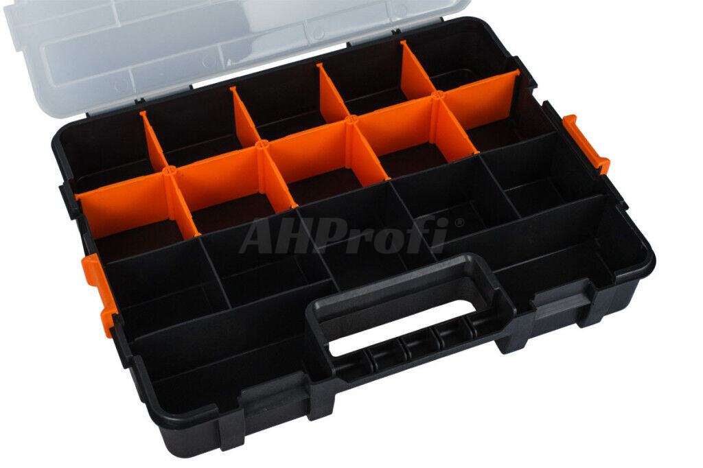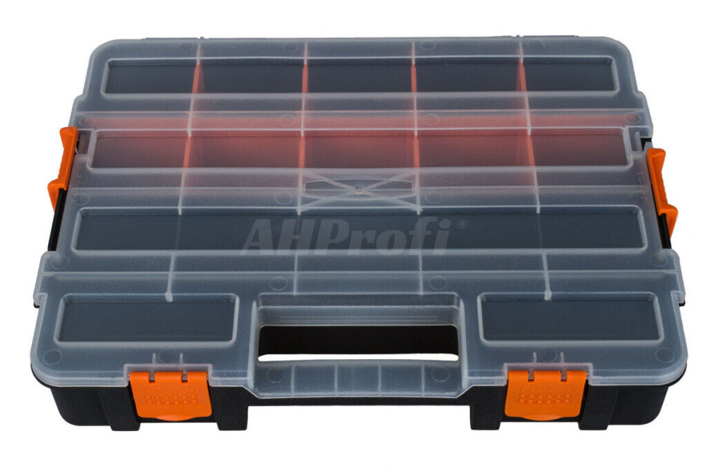 Plastový kufrík vhodný na uskladňovanie skrutiek atď. Organizér má 17 priehradiek a rozmery 37,5x29x6,7 cm.