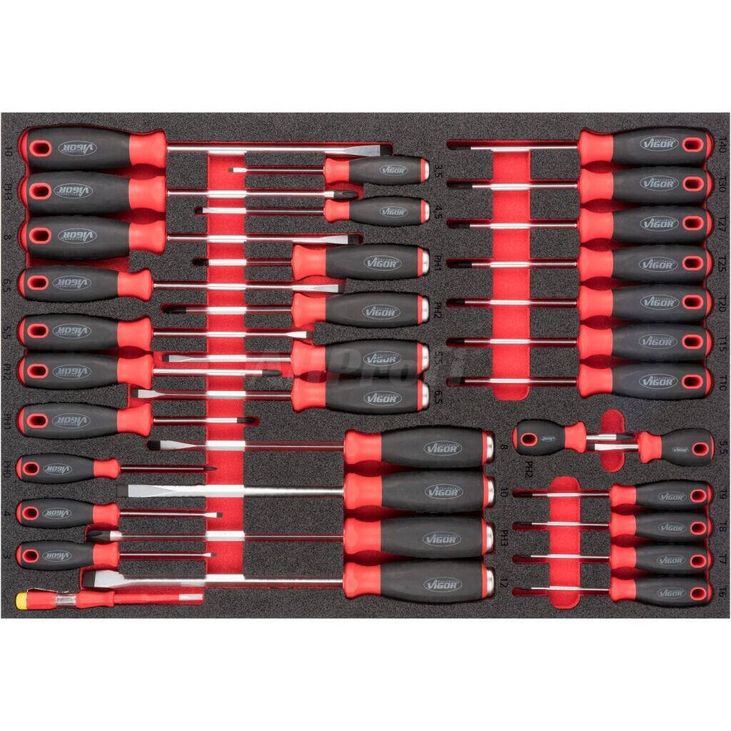 Ploché a krížové skrutkovače v penovej výplni, 34 ks, VIGOR - V6813