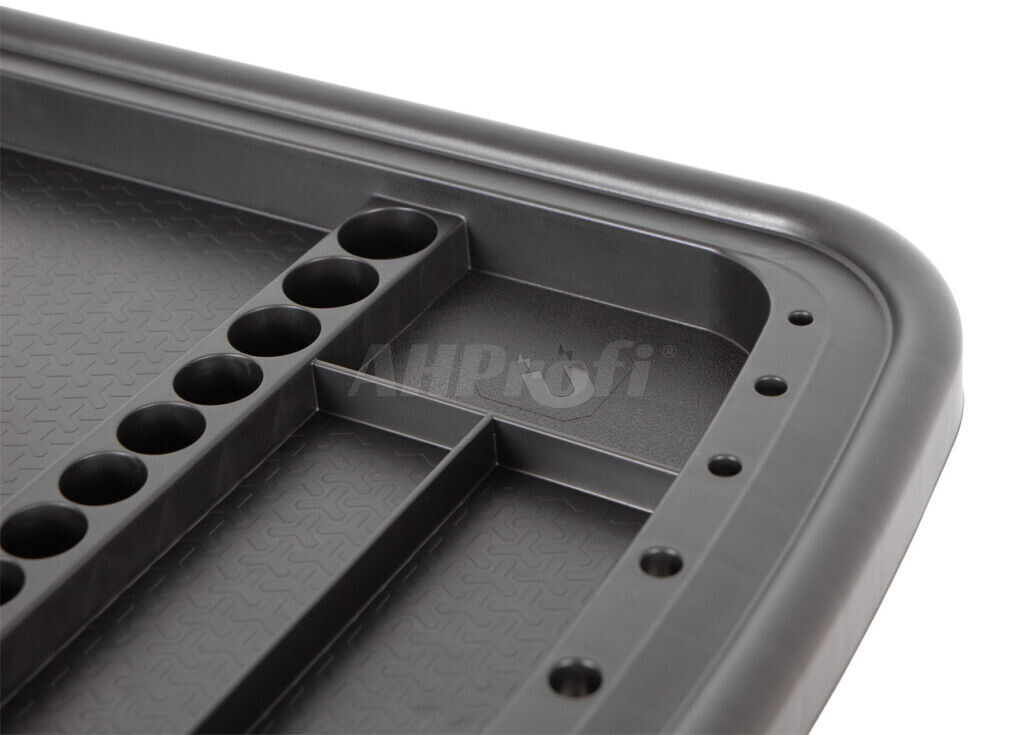 - Úložné možnosti vďaka tvarovaným otvorom pre rôzne veľkosti nástavcov, hlavíc a skrutkovačov.