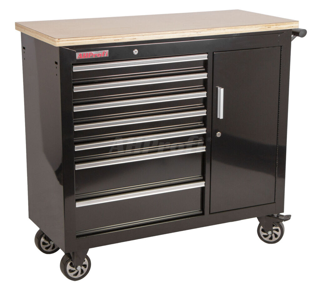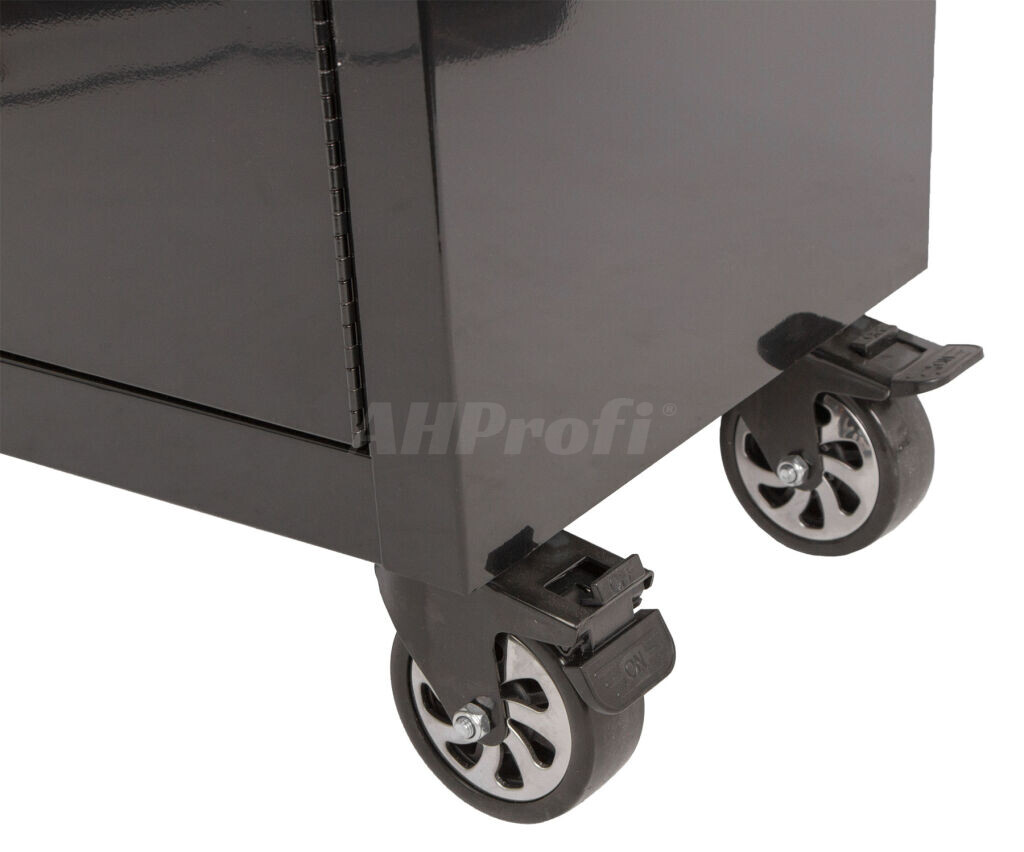 Čierný kovový dielenský vozík so 7 šuplíkmi a skrinkou. Vozík je vhodný na náradie nezbytné pre prácu v dielni alebo servisu.