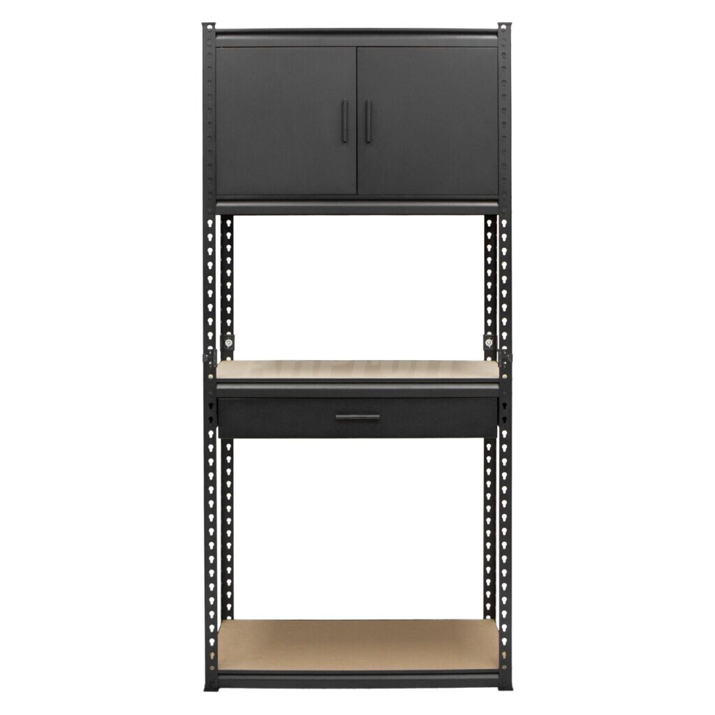Policový regál s hornou skrinkou a 1 zásuvkou, 2 otvorené MDF police. Rozmer 815 x 465 x 1825 mm, nosnosť 575 kg. Perforovaná konštrukcia pre jednoduchú montáž. Vhodné na kombináciu s ďalšími regálmi.