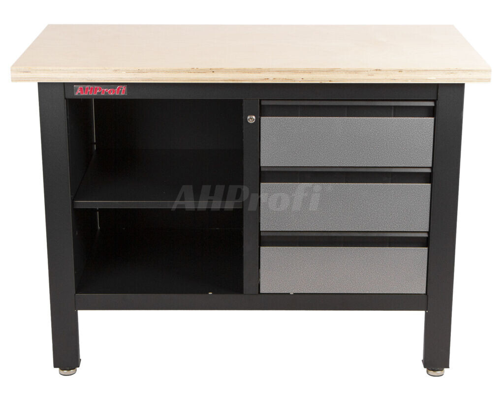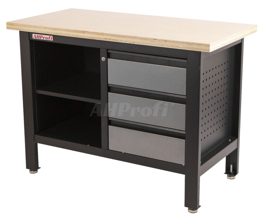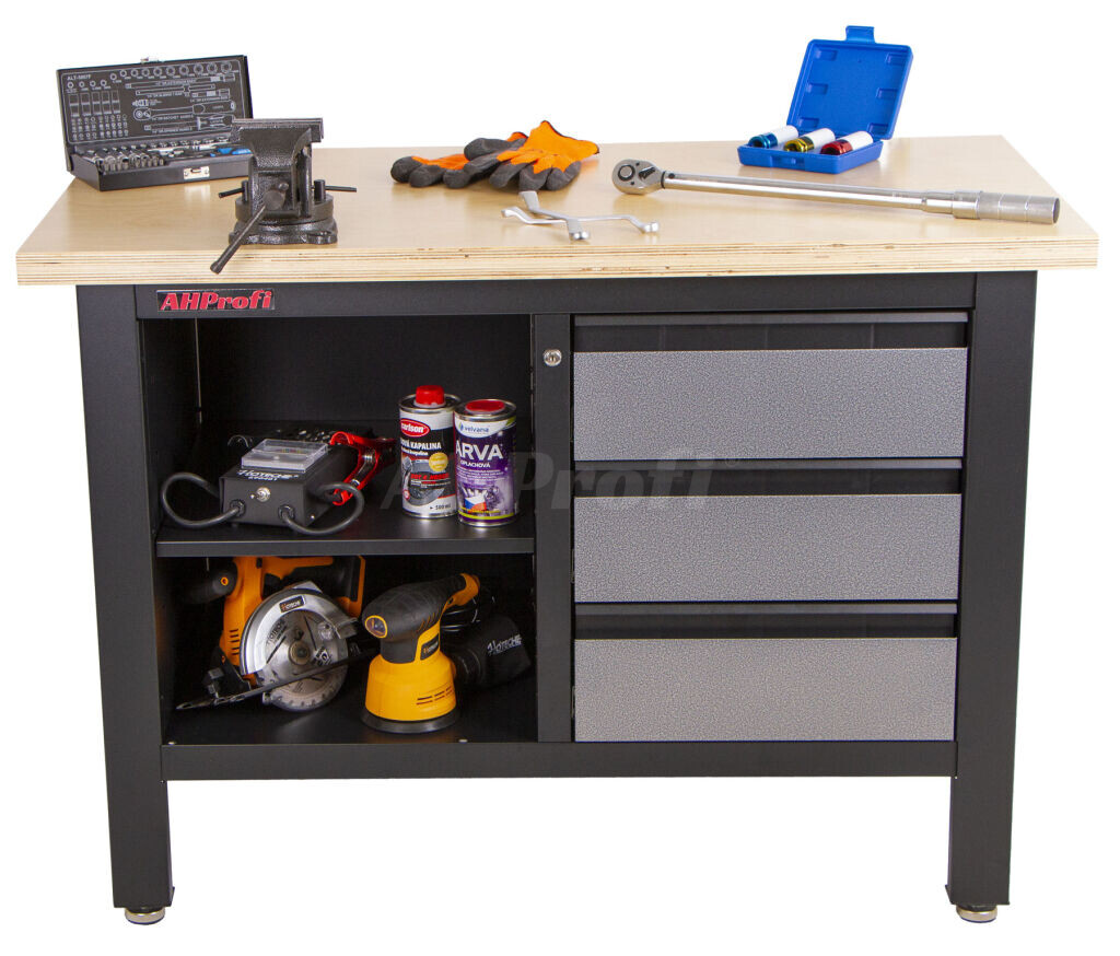 Kovový ponk v rozmeroch 1200 x 865 x 600 mm. Drevená pracovná doska, 3 šuplíky, regál. Hmotnosť 65 kg.