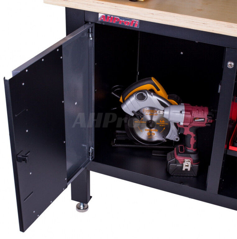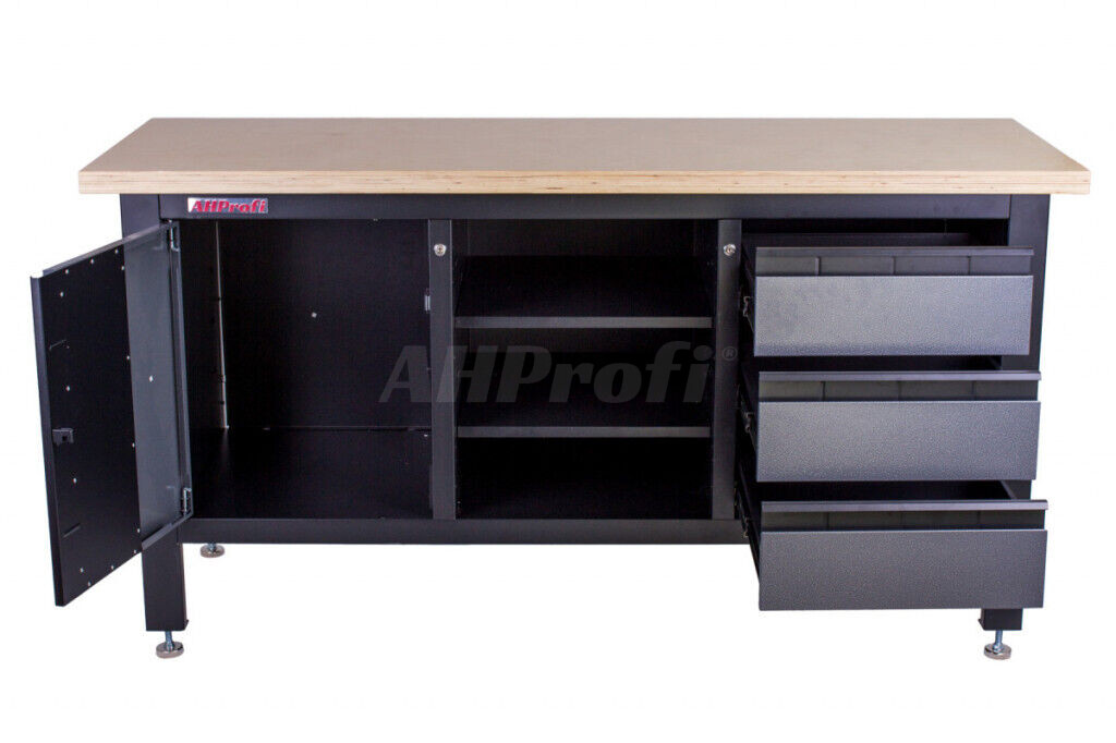 Profesionálny kovový ponk vhodný pre najnáročnejšie použitie. Nosnosť pracovného stola je 300 kg. Je vybavený drevenou pracovnou doskou s rozmermi 1690 x 600 mm, skrinkou, 3 zásuvkami a 3 regálmi.
