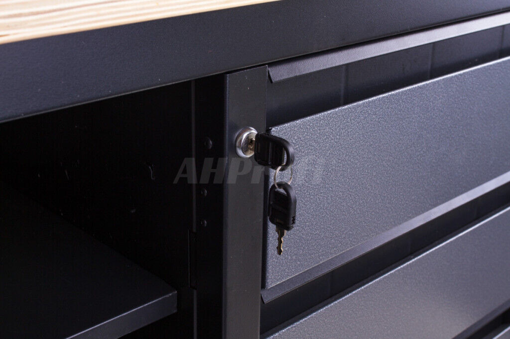 Profesionálny kovový pracovný stôl s tromi zásuvkami, skrinkou a policou, pracovnou doskou z masívneho dreva a špeciálnou odolnou povrchovou úpravou.