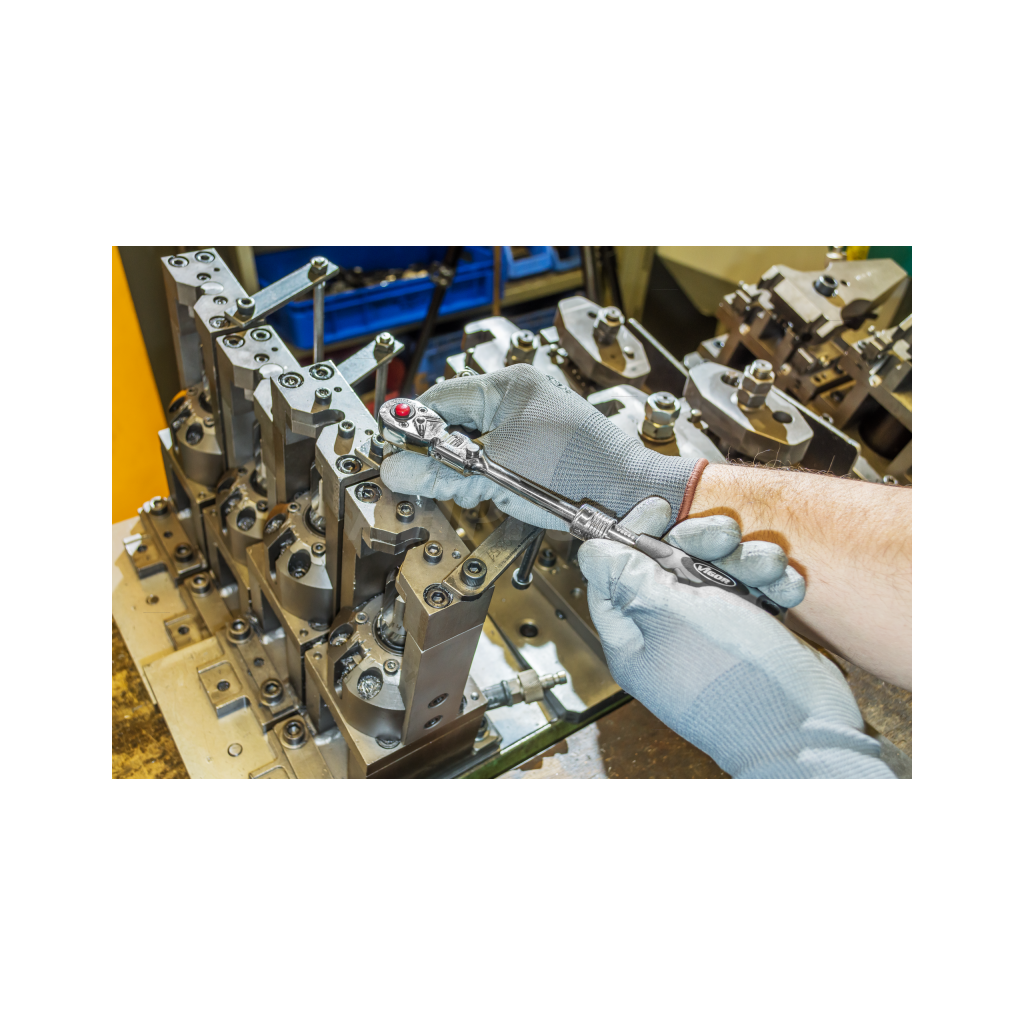 Prepínacia račňa 1/4" s otočnou hlavou o 180° vrátane aretácie s 5-timi stupňami. Dĺžku račne môžete meniť v rozpätí 175 - 225 mm vďaka fixačným bodom v teleskopickej časti.