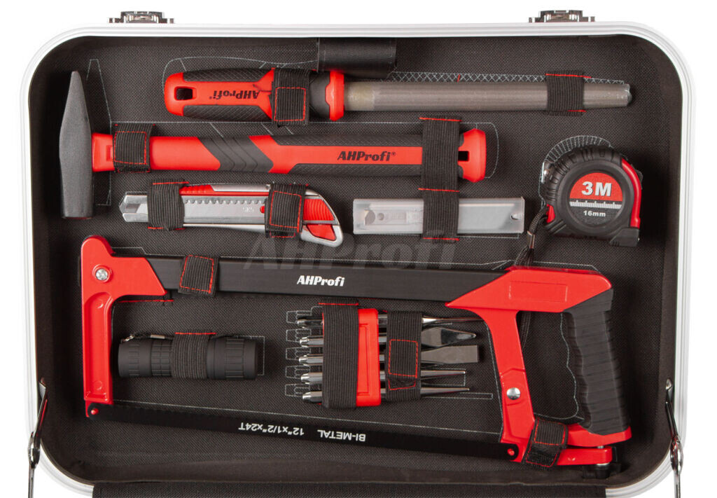 | Sada obsahuje: | Skrutkovače, Golu, Meter, Pílku, Skúšačku, Kliešte, Očkoploché kľúče, Sadu bitov, Vyrážače, Kladivo / palicu, Nôž, Predlžovacie nástavce, Svietidlo, Imbus, Nástrčné kľúče, Pilníky |
