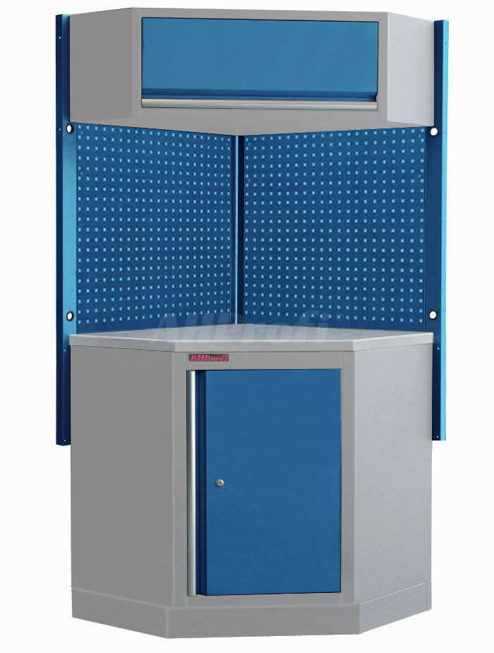 Zostava 9 ks, 940 x 495 x 2000 mm, nerezová pracovná doska, modulárna, celokovová, modrá. Rohová horná výklopná skrinka. Rohová spodná skrinka. 2 dierované dosky s roztečí 38 x 38 mm. Kvalitný dielenský nábytok vhodný pre profesionálne servisy aj domáce garáže a dielne.