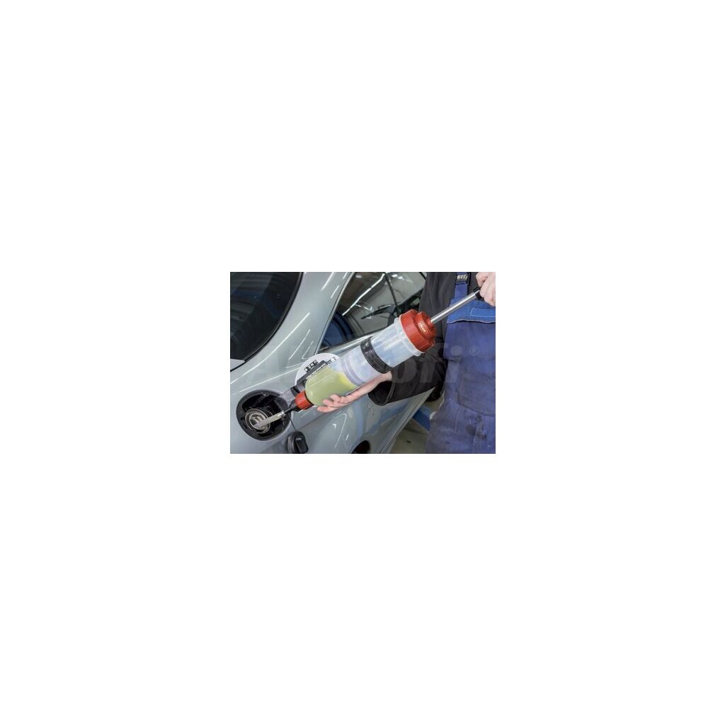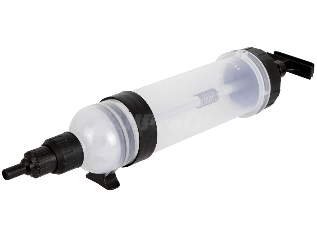 Ručná plnička a odsávačka prevádzkových kvapalín typu injekčná striekačka s obsahom zásobníka 1,5 l.