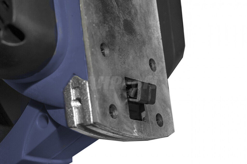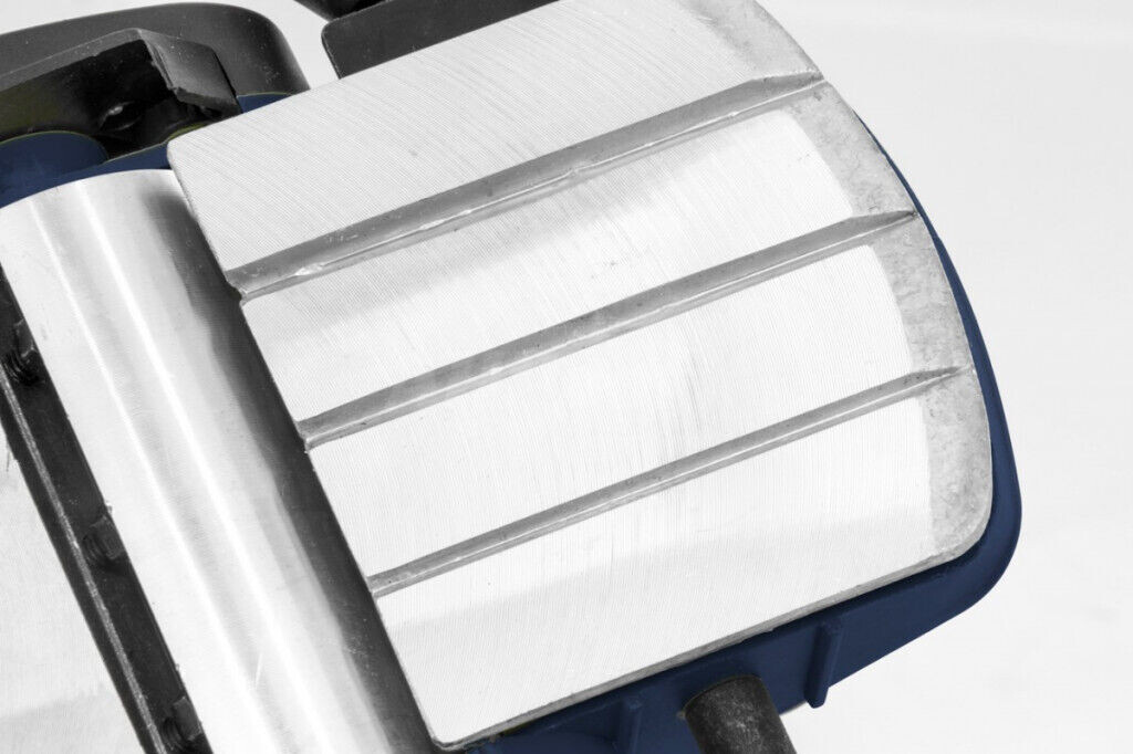 Konstrukce: ergonomicky tvarované rukojeti s tlumicími vložkami, podélný/falcovací doraz, dvojitý výfuk třísek (→ oboustranný odhoz hoblin), parkovací botka (→ bezpečné odkládání hoblíku bez poškození dřeva/nožů).