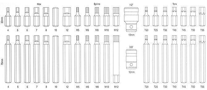 Kompletná sada 40 najpoužívanejších bitov s profilmi H (Imbus) - šesťhran, M (XZN, SPLINE) - tisíchran a T (Torx) - hviezdička. Sada samozrejme obsahuje chrómové adaptéry na pripojenie bitov na račne 1/2 "a 3/8".