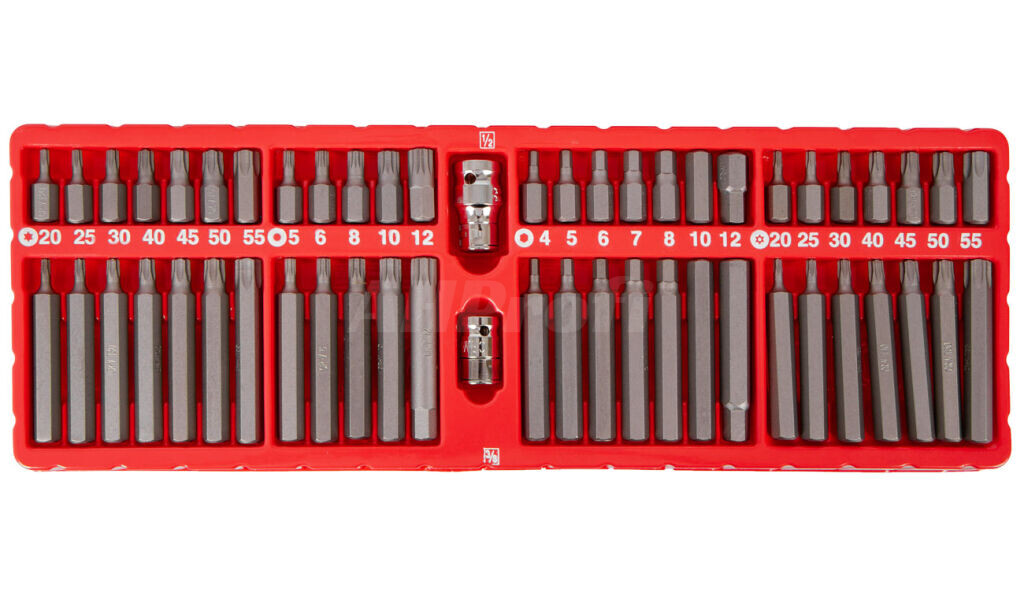 Kompletná sada 54 ks najpoužívanejších bitov s profilmi Imbus, XZN (tisícihran, Torx a Torx s dierou).