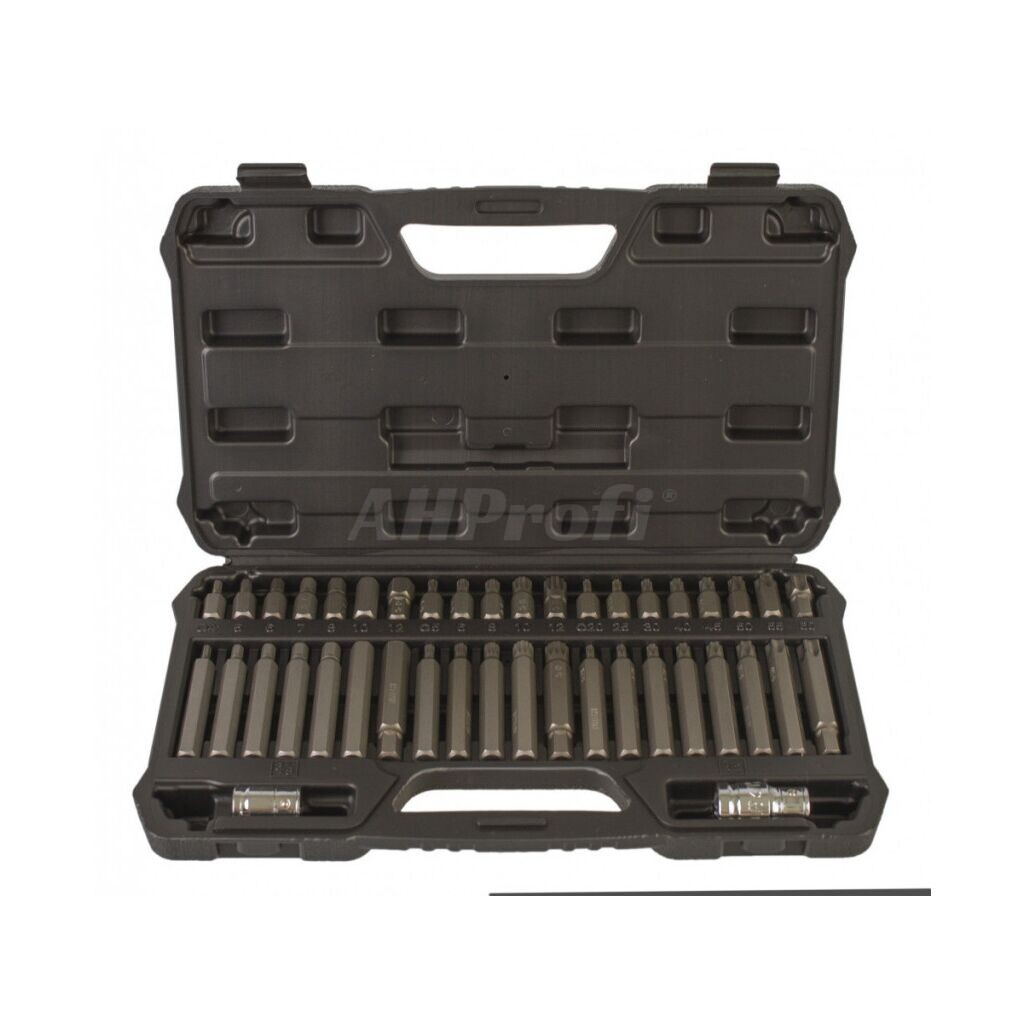 Kompletná sada 42 najpoužívanejších bitov s profilmi H (Imbus) - šesťhran, M (XZN, SPLINE) - tisíchran a T (Torx) - hviezdička. Sada samozrejme obsahuje chromové adaptéry k pripojeniu bitov na račne 1/2" a 3/8".