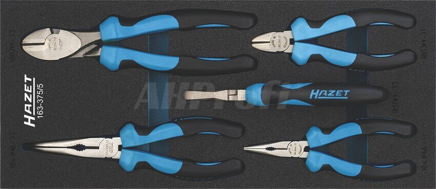 Sada klieští, kvalitný nemecký výrobca HAZET, penová vložka, vhodná pre dielenské vozíky HAZET, obsahuje 5 kusov klieští - ploché, štiepacie a kombinované.