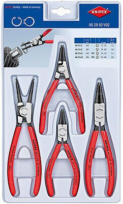 Vybavené bežnými kliešťami na poistné krúžky pre vnútorné i vonkajšie krúžky. Atraktívne predajné balenie s dierovaním pre samoobslužný predaj. Stabilný plastový obal- vhodný tiež k ďalšiemu uloženiu klieští. 4-dielna.
