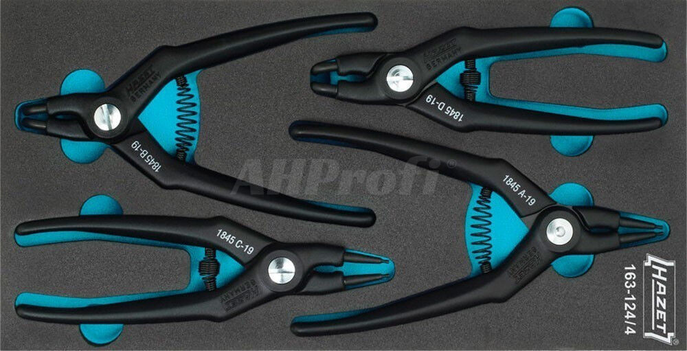 Sada kvalitných klieští pre poistné krúžky HAZET, 4 kusy v penovej vložke, obsahuje kliešte pre vnútorné i vonkajšie poistné krúžky.