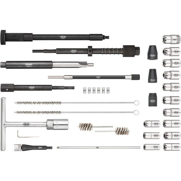 Čistiaca sada pre sedlá vstrekovačov, 23 kusov vrátane strediacej korunky, čistiace nástroje, tesniace zátky, šesťhranné T-rukoväte, ai. Vhodná pre motory MERCEDES-BENZ CDI a vstrekovače Bosch/Delphi.