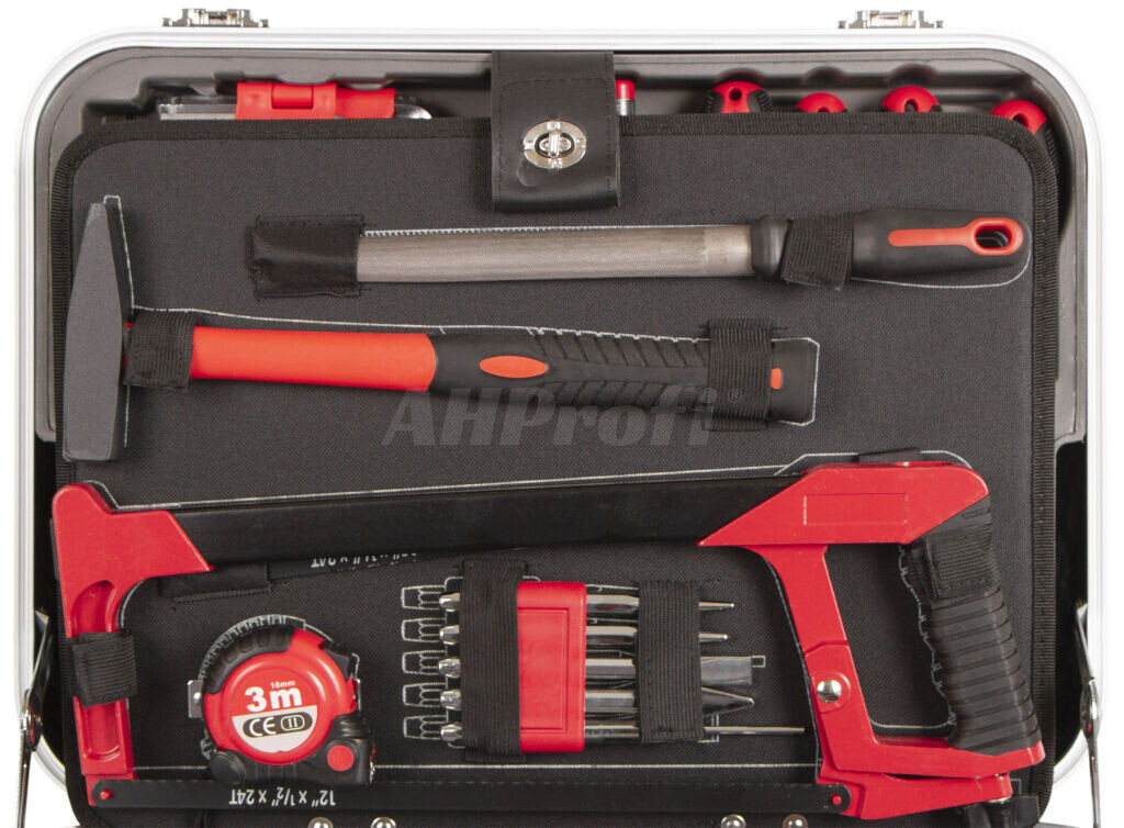 Vo vnútri kufra sa nachádza niekoľko sád profesionálneho náradia. Náradie je vyrobené zo zliatiny Cr-V a jeho ergonomické rukoväte sú príjemne pogumované, takže nekĺžu, padnú do každej ruky a zaistia pohodlný úchop.