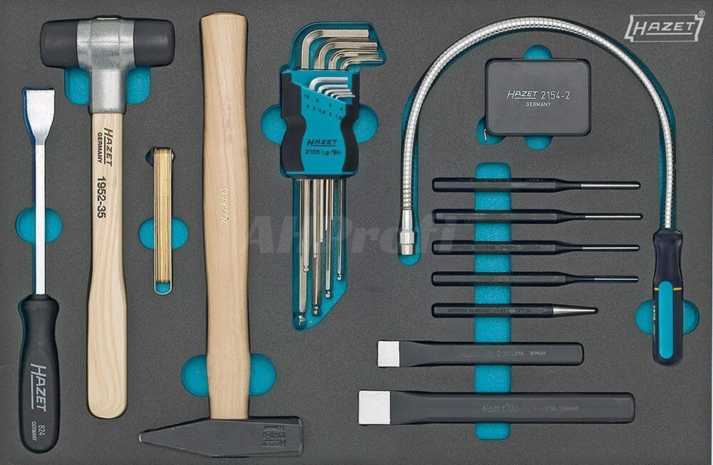 Sada kvalitného nemeckého náradia HAZET, 22 kusov v penovej vložke, ideálne do pojazdných vozíkov, obsahuje kladivo a palicu, sadu vyrážačov a ďalšie náradie.