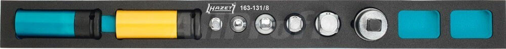Sada nástrčných kľúčov od nemeckého výrobcu HAZET, 8 kusov v podlhovastej penovej vložke, obsahuje nástrčné kľúče 17 a 19 mm na alu kolesá a adaptéry.