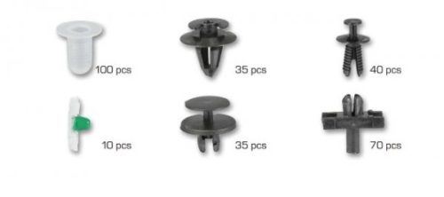 Sada najpoužívanejších príchytiek / cvočkov pre čalúnenie a plastové diely vozidiel BMW. 6 rôznych druhov, celkom 290 ks.