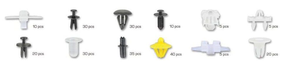 Sada najpoužívanejších príchytiek / cvočkov pre čalúnenie a plastové diely vozidiel Mercedes-Benz. 12 rôznych druhov, celkom 270 ks.
