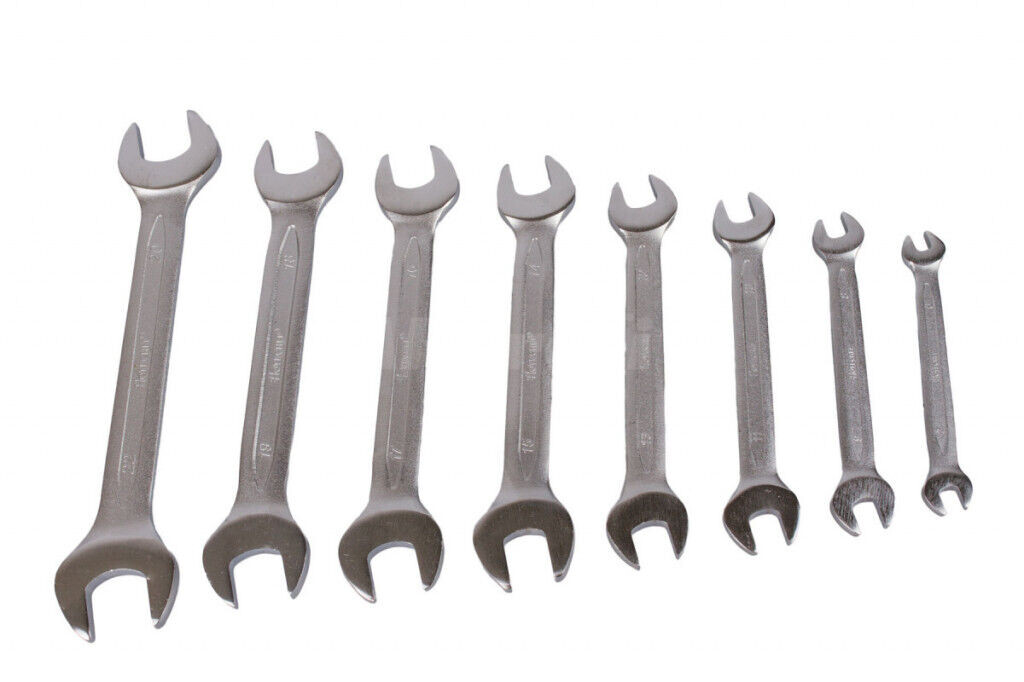 Ploché kľúče v sade 8 ks, ktorá je prehľadne uložená v plastovom držiaku. Vďaka držiaku je potom sada úspornejšia na skladovací priestor a hodí sa ako na cesty, tak na montáže. Kľúče sú vyrobené z kvalitnej chrom-vanadiovej ocele s tvrdosťou HRC40-48.