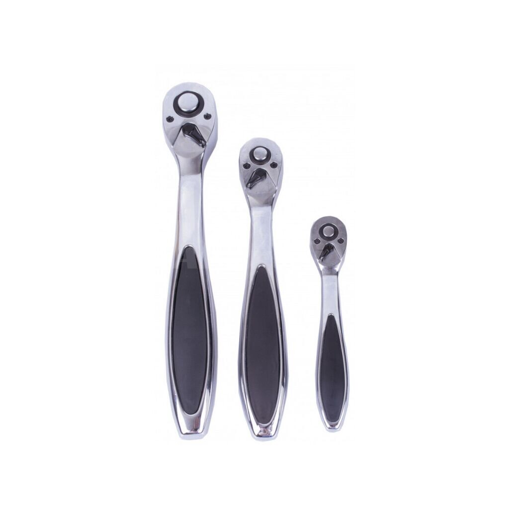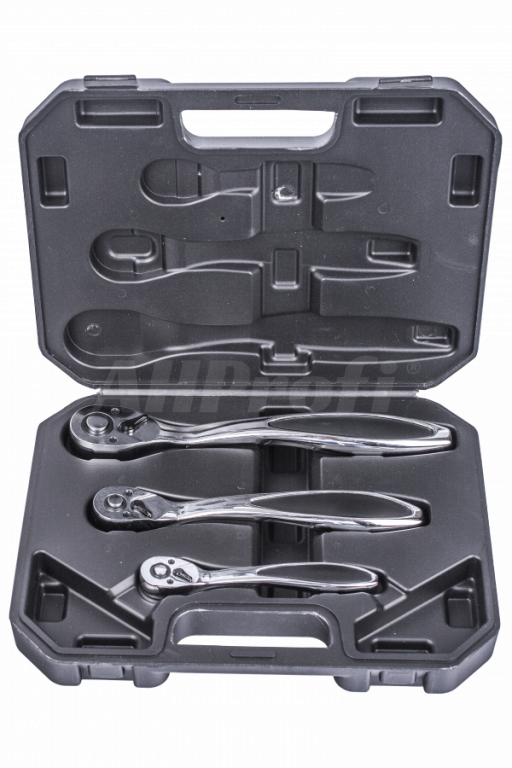 Celokovové pochrómované račne, sada 3 kusov 1/4", 3/8", 1/2" v plastovom kufri. 72 zubov, pravý aj ľavý chod, ergonomické protišmykové rukoväte, celokovové telo s chrómovaným povrchom.