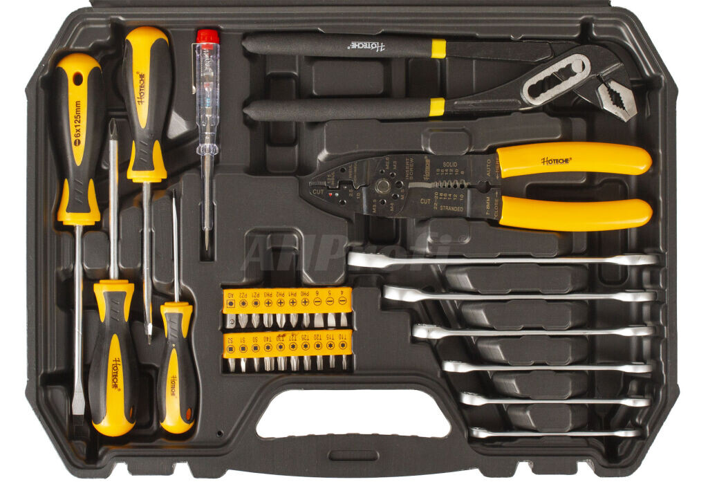 | Sada obsahuje: | Golu, Kliešte, Predlžovacie nástavce, Kladivo / palicu, Odizolovacie kliešte, Skúšačku, Kardanový kĺb, Očkoploché kľúče, Skrutkovače, Hlavica s bity, Nástrčné kľúče, Spojovací materiál |