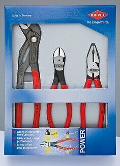 Sada kvalitných silových klieští Knipex, obsahuje 3 kusy klieští - kombinačnou, bočné štiepacie a SIKO kliešte.