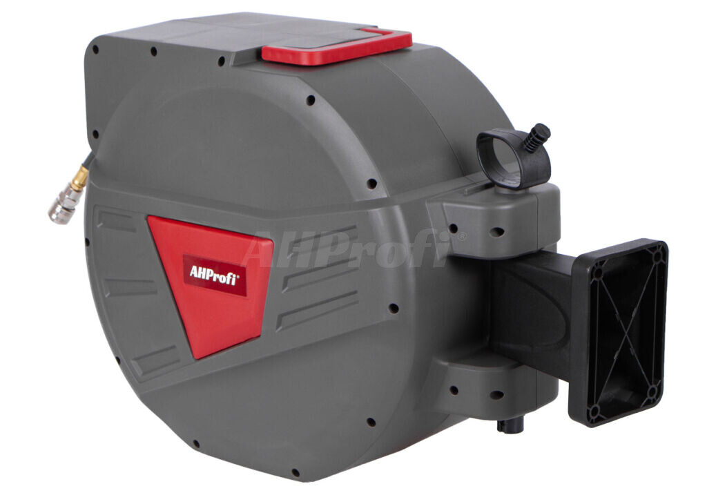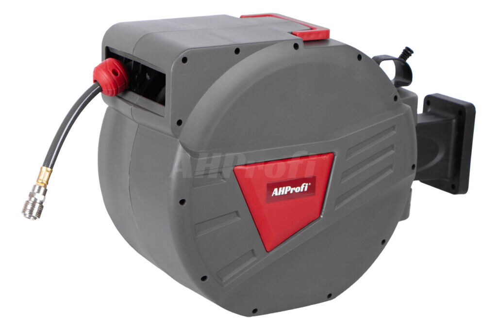 Samonavíjací bubon s 30 metrovou PVC hadicou na stlačený vzduch + 2 metre dlhá hadica k zdroju. Pracovný tlak 18 bar, maximálny tlak 24 bar.