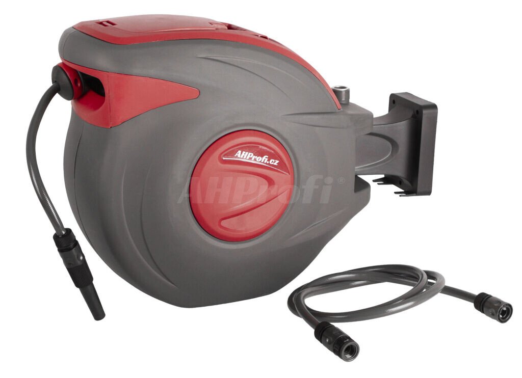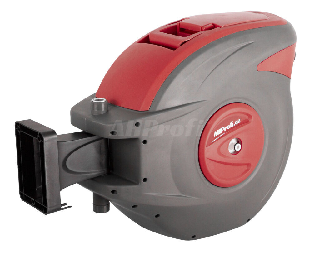 Samonavíjací bubon z odolného plastu s 30 metrovou vysokotlakovou hadicou na vodu, hadica ukončená rýchlospojkou, max. tlak 10 bar.