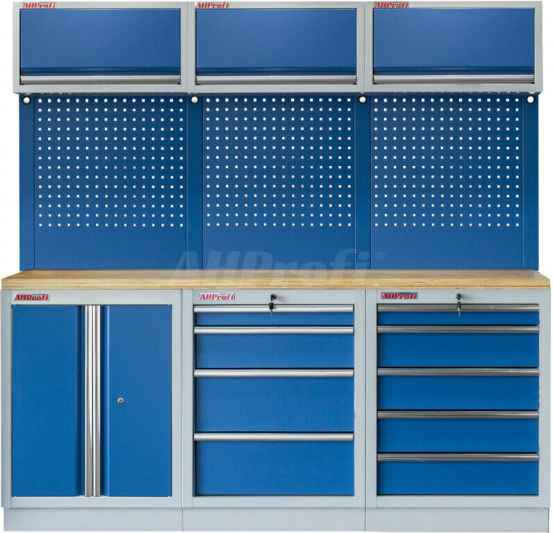 Zostava 14 ks, 2040 x 495 x 2000 mm, drevená pracovná doska, modulárna, celokovová, modrá. Horné skrinky: 3 výklopné. Spodné skrinky: dvojkrídlové / 4 a 5 šuplíková. 3 dierované dosky s roztečí 38 x 38 mm. Kvalitný dielenský nábytok vhodný pre profesionálne servisy aj domáce garáže a dielne.