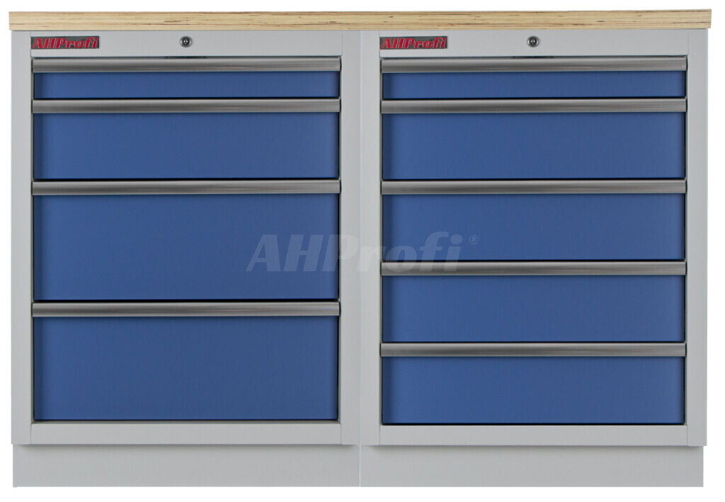 Dielenský nábytok PROFI BLUE s drevenou doskou zaujme moderným a profesionálnym vzhľadom. Kombinácia modrej RAL 5023 a šedej RAL 7035 sa bude vynímať v každej garáži aj dielni.