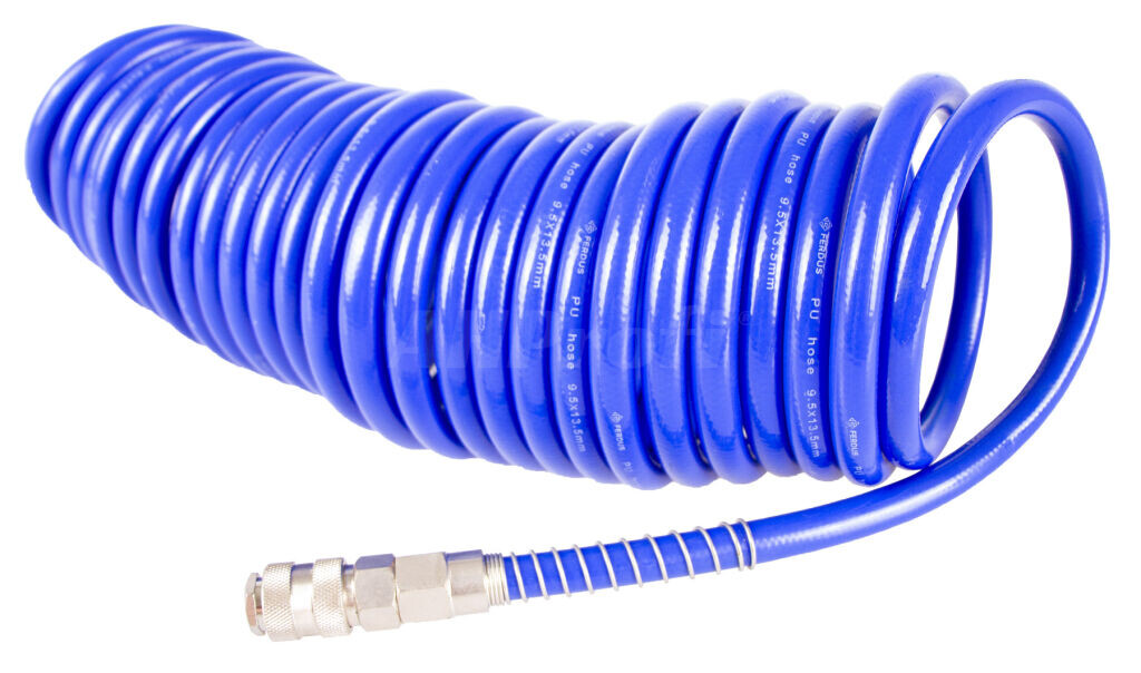 Špirálová hadica na stlačený vzduch s celkovou dĺžkou 5 m, vnútorný priemer 9,5 mm, max. Tlak 13 bar, zakončená rýchlospojkami.