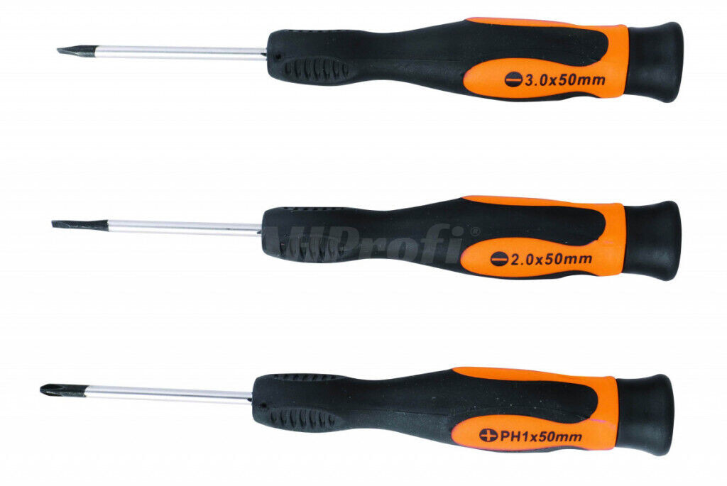 Sada 3 ks precíznych svidríkových skrutkovačov na elektroniku s plastovou pogumovanou rukoväťou.