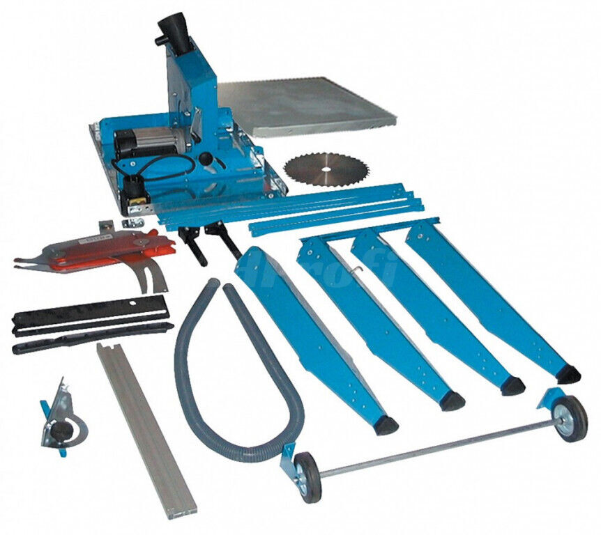 Konstrukce: stabilní ocelový rám, prodloužený pracovní stůl (→ zadní přídavný nástavec), kryt řezného kotouče s integrovaným zařízením pro odvod pilin, příčný/podélný/úhlový doraz, přípojka odsávání.