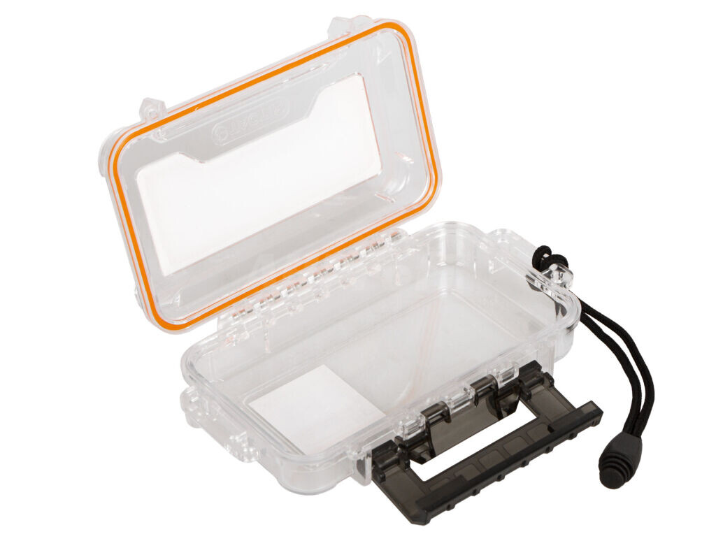 Vodotesné pevné plastové puzdro s pútkom na zavesenie na zápästie.