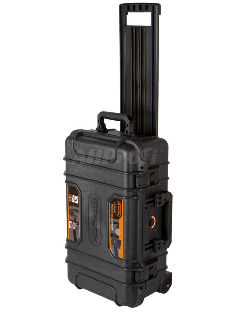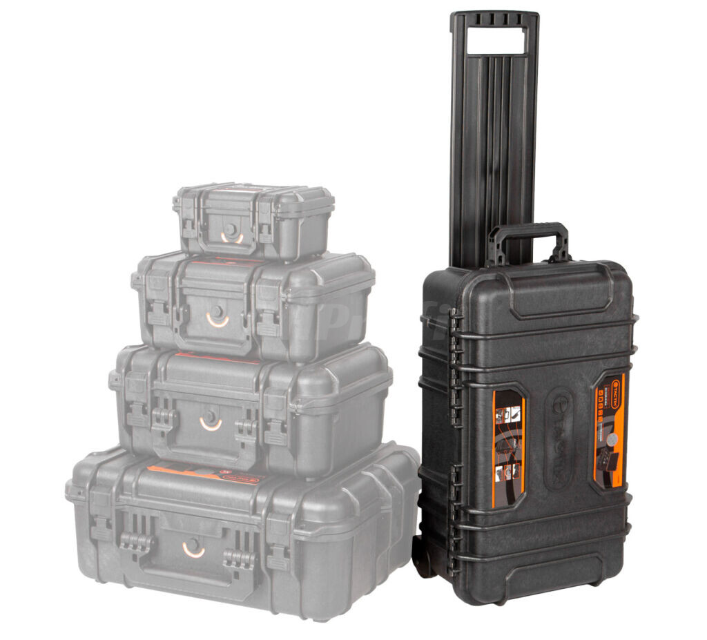 Vodotesný plastový kufor s predrezanou penovou výplňou a kolieskami. Rozmery: 558 x 352 x 232 mm.
