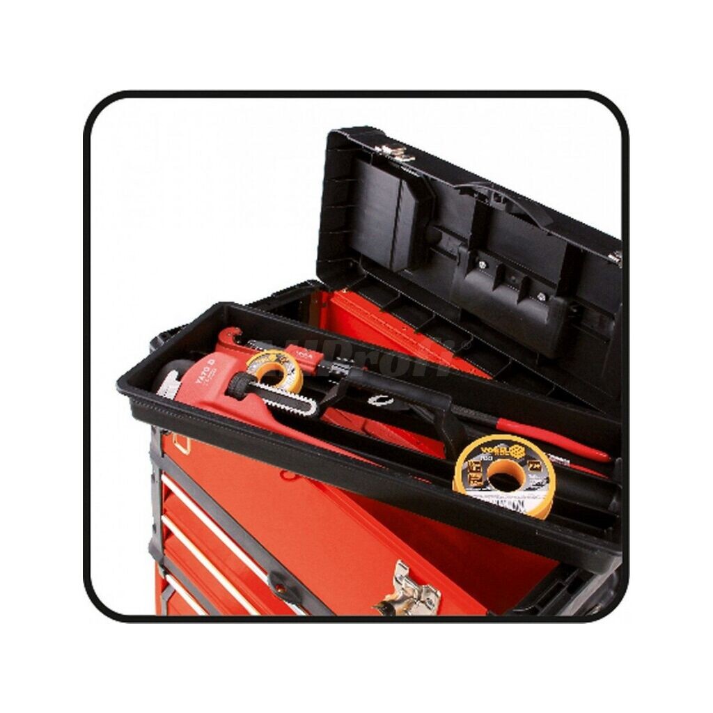 Modulárna skriňa / box na náradie - 3-dielna. Súprava sa skladá z hlavného modulu, kde nájdeme vstavané kolesá, teleskopickú hliníkovú rukoväť. Nosnosť hlavného modulu je 15kg a rozmery 410x210x280mm. Stredný modul má 2 kovové zásuvky s nosnosťou 5kg a rozmer jednotlivej zásuvky je 390x215x60mm. Do týchto zásuviek je možné vložiť vložky s náradím YATO. Zásuvky sú na kovových guličkových ložiskách. Horný modul je klasický s horným vekom s rozmermi 420x220x150mm a nosnosťou 20kg. Má vstavané 2 malé organizátory a vnútri vložku na náradie. Má rovnú hornú plochu, ktorá môže slúžiť ako pracovná doska. Navyše majú drážku, ktorá je veľmi užitočná pri vŕtaní alebo skrutkovaní. Okrem toho, že moduly sú vybavené komfortnou a protišmykovou rukoväťou a bočnou rukoväťou pre ľahké zdvíhanie majú tiež protišmykové dolné hrany rohov. Skriňu môžete rozšíriť o ďalší modul pridaním modulu YT-09107 alebo YT-09108. Moduly majú horné a stredné kovové istenie medzi sebou.